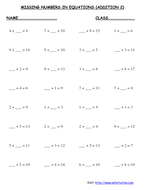 Missing Numbers in Equations (Blanks) - Math-Drills Students can use math worksheets to master a math skill through practice, in a study group or for peer tutoring. Use the buttons below to print, open, or download the PDF version of the Missing Numbers in Equations (Blanks) -- Addition (Range 1 to 9) (A) math worksheet. The size of the PDF file is 22047 bytes.